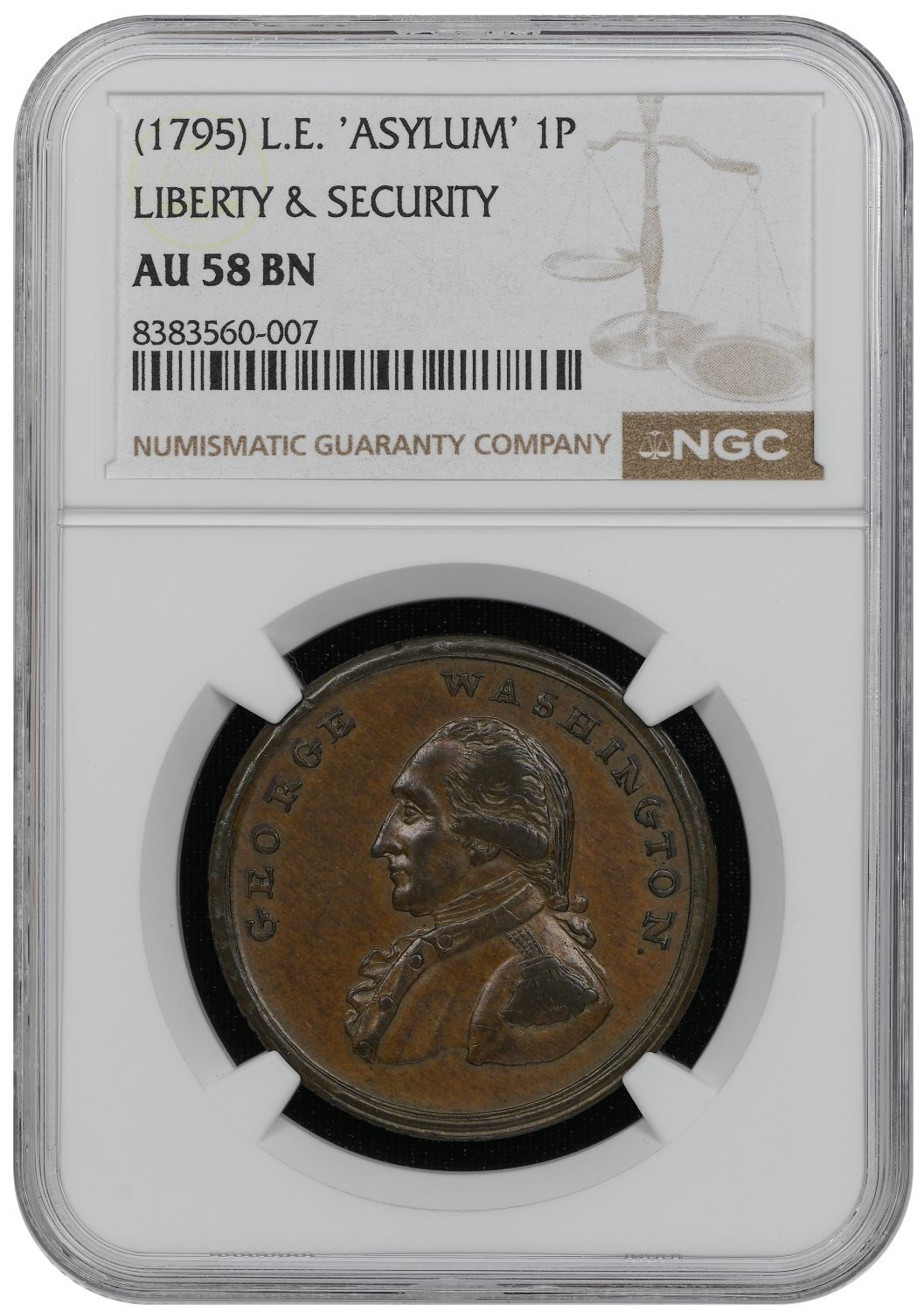 • 1795 L.E. ‘ASYLUM’ 1P Liberty & Security NGC AU58 BN