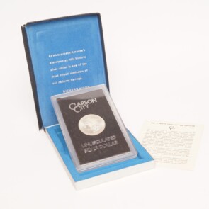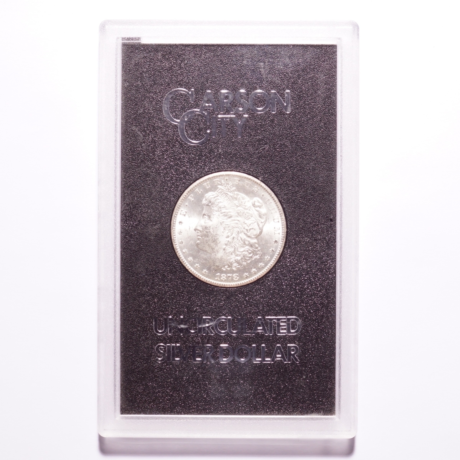 This is an 1878-CC Morgan Silver Dollar GSA. The top (or lid) to the box is original, but has been separated from the lower portion of the box. The photographs are of the exact coin you will receive.