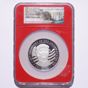 This is a 2017 Equatorial Guinea 1000 Francos Silver Donald Trump NGC PF69 Ultra Cameo IR. This is Inaugural Releases. Notice the adhesive on the plastic. We chose to leave it as to not to damage the holder. The photographs are of the exact coin you will receive.